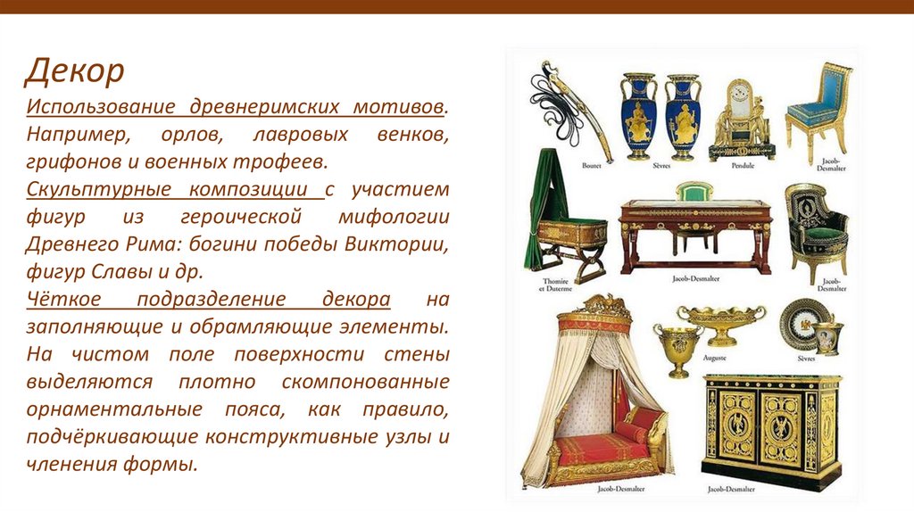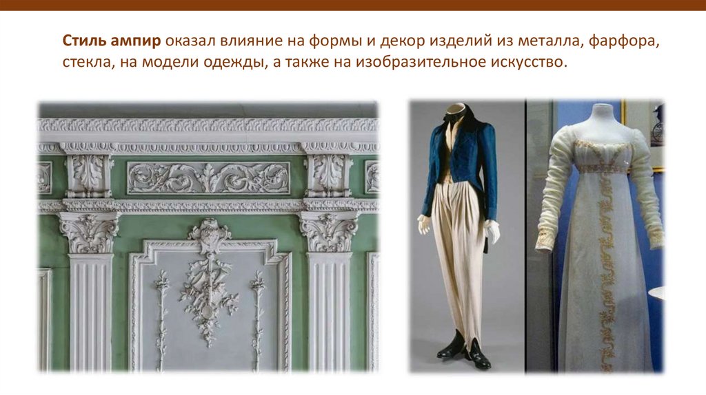 Стиль ампир оказал влияние на формы и декор изделий из металла, фарфора,стекла, на модели одежды, а также на изобразительное искусство.