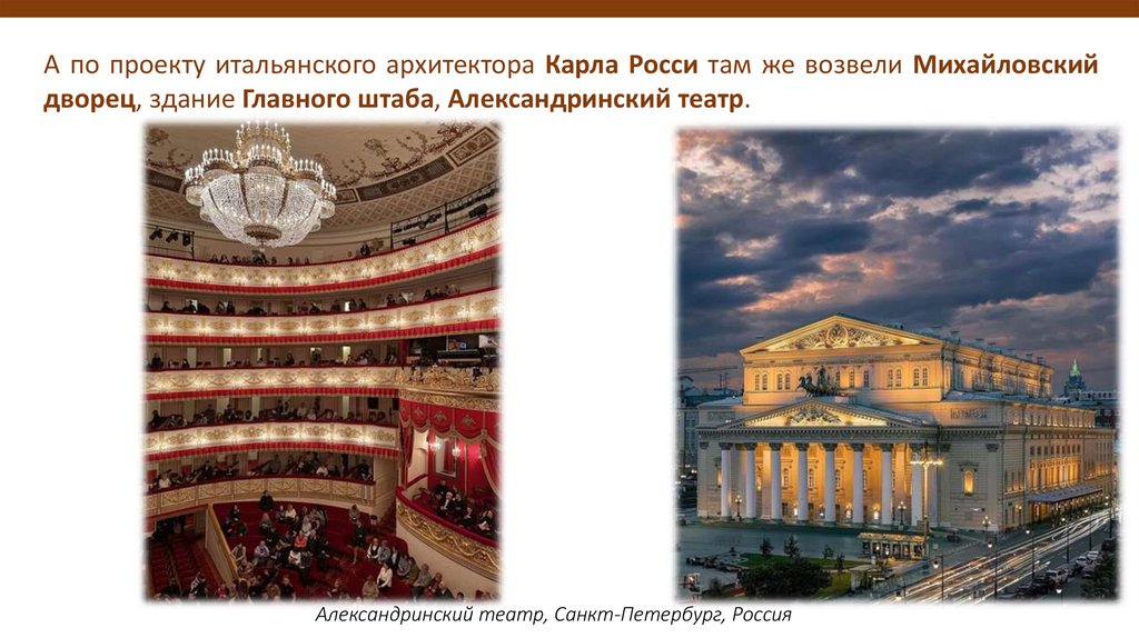 А по проекту итальянского архитектора Карла Росси там же возвели Михайловскийдворец, здание Главного штаба, Александринский театр.