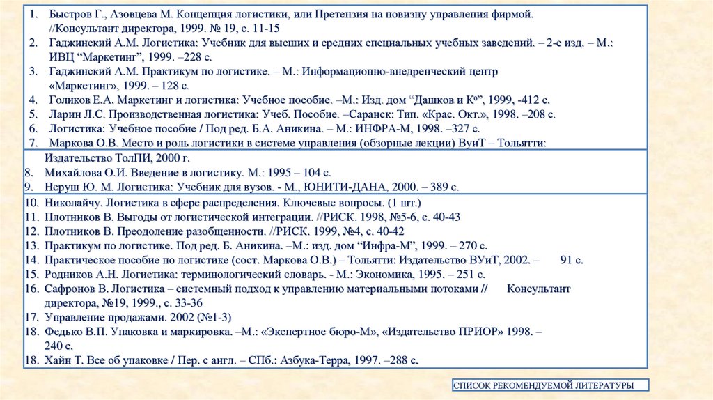 1. Быстров Г., Азовцева М. Концепция логистики, или Претензия на новизну управления фирмой.//Консультант директора, 1999. № 19, с. 11-15