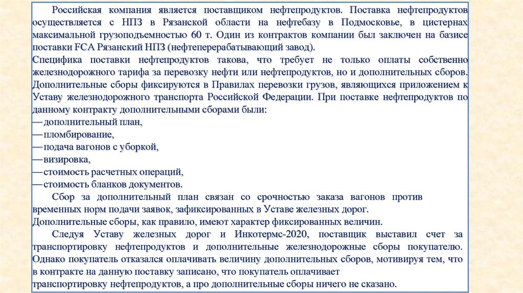 Российская компания является поставщиком нефтепродуктов. Поставка нефтепродуктовосуществляется с НПЗ в Рязанской области на нефтебазу в Подмосковье, в цистернах