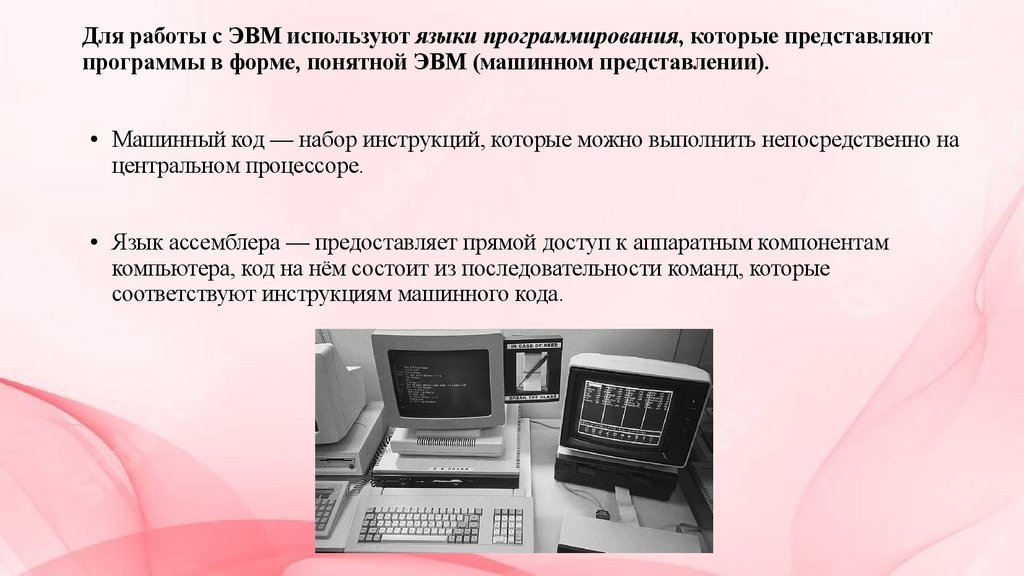 Для работы с ЭВМ используют языки программирования, которые представляютпрограммы в форме, понятной ЭВМ (машинном представлении).