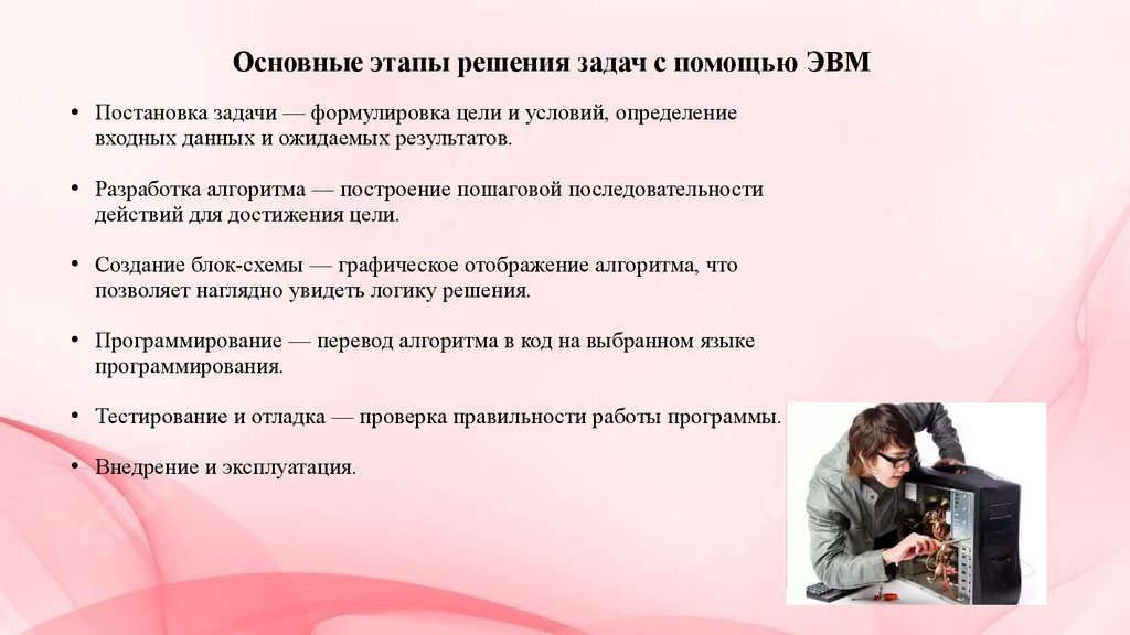 Основные этапы решения задач с помощью ЭВМПостановка задачи — формулировка цели и условий, определение