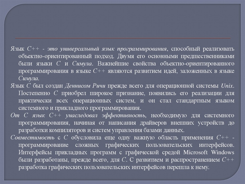 Язык С++ - это универсальный язык программирования, способный реализоватьобъектно-ориентированный подход. Двумя его основными предшественниками