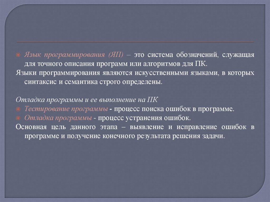 Язык программирования (ЯП) – это система обозначений, служащаядля точного описания программ или алгоритмов для ПК.