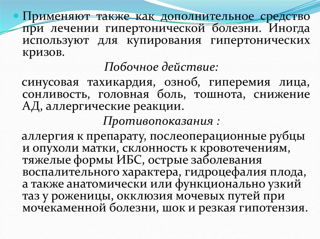 - содержит сумму алкалоидов спорыньи.Применяют при маточных кровотечениях, в