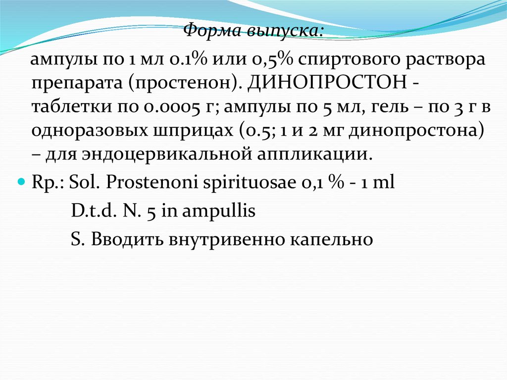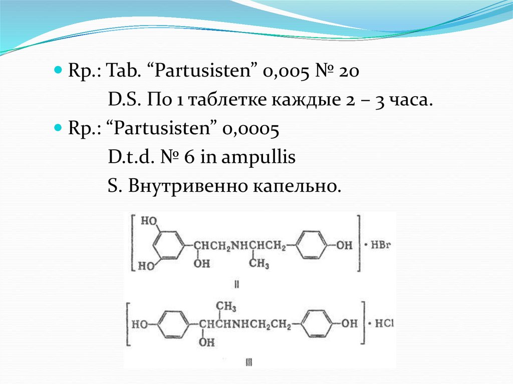 Rp.: Tab. “Partusisten” 0,005 № 20D.S. По 1 таблетке каждые 2 – 3 часа.