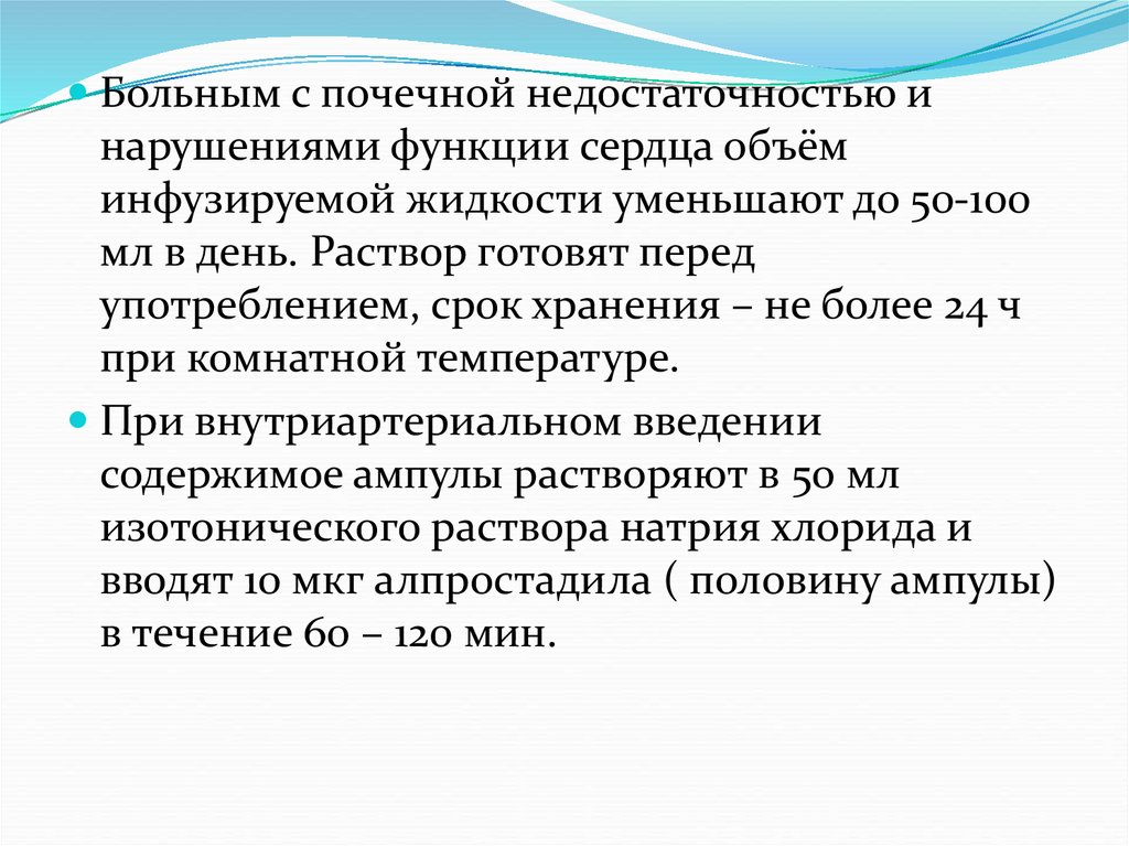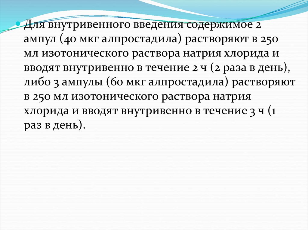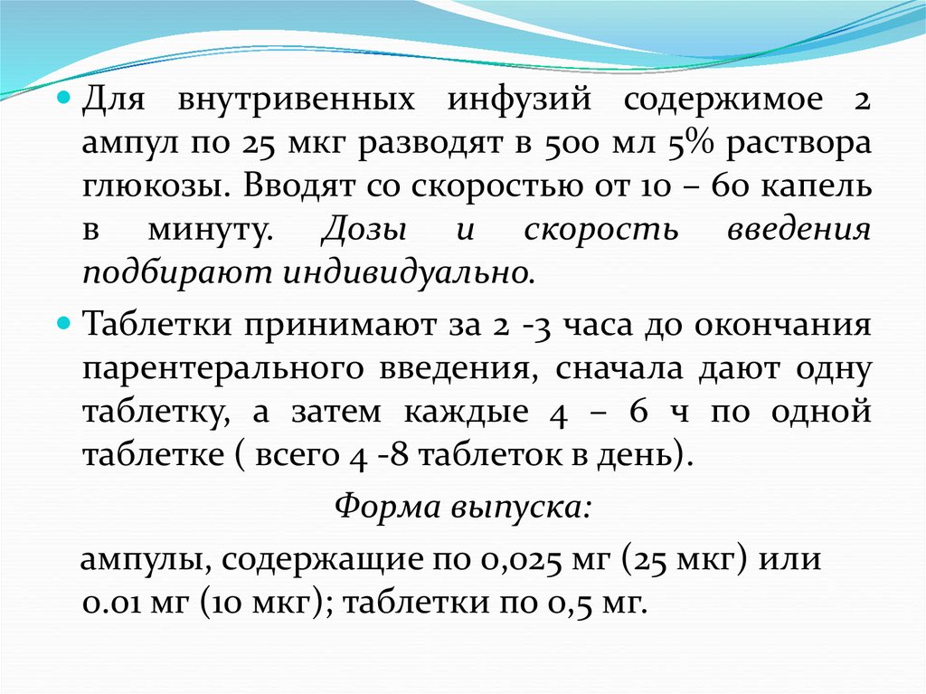 Для внутривенных инфузий содержимое 2ампул по 25 мкг разводят в 500 мл 5% раствора