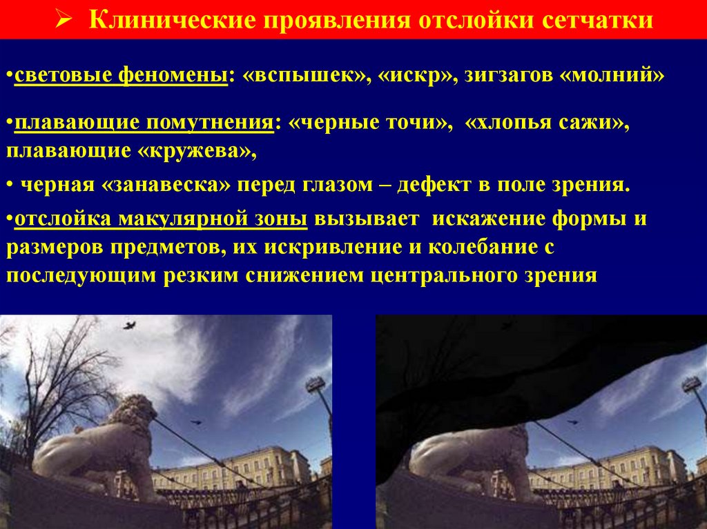 Клинические проявления отслойки сетчатки•световые феномены: «вспышек», «искр», зигзагов «молний»