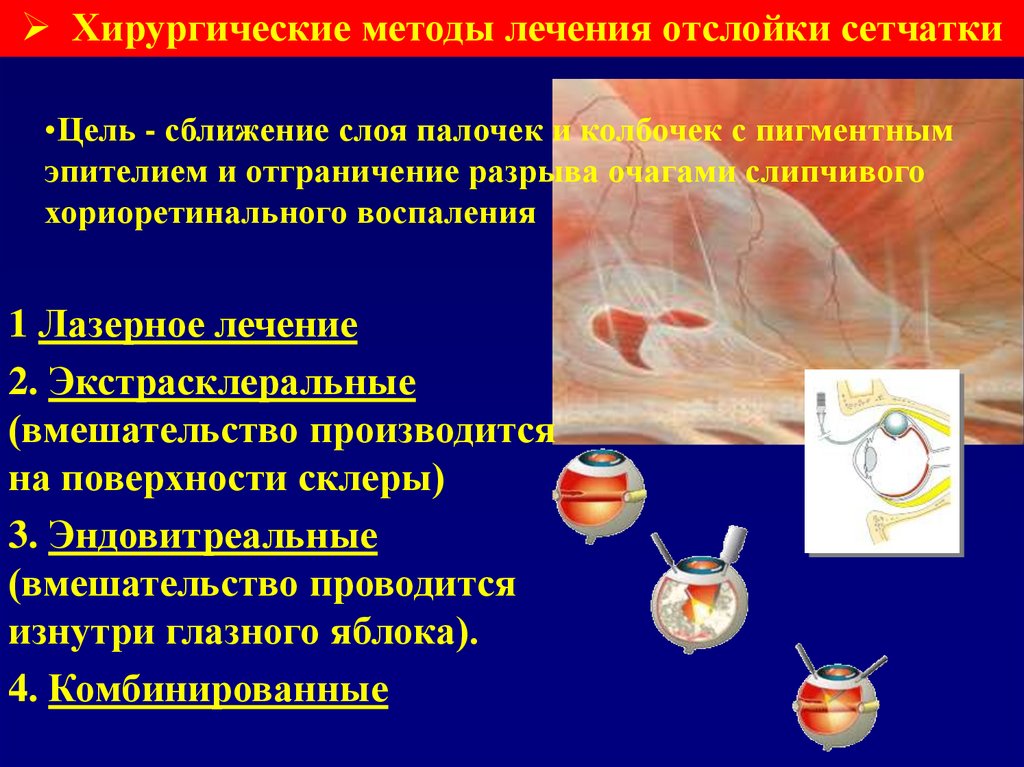 Хирургические методы лечения отслойки сетчатки•Цель - сближение слоя палочек и колбочек с пигментным