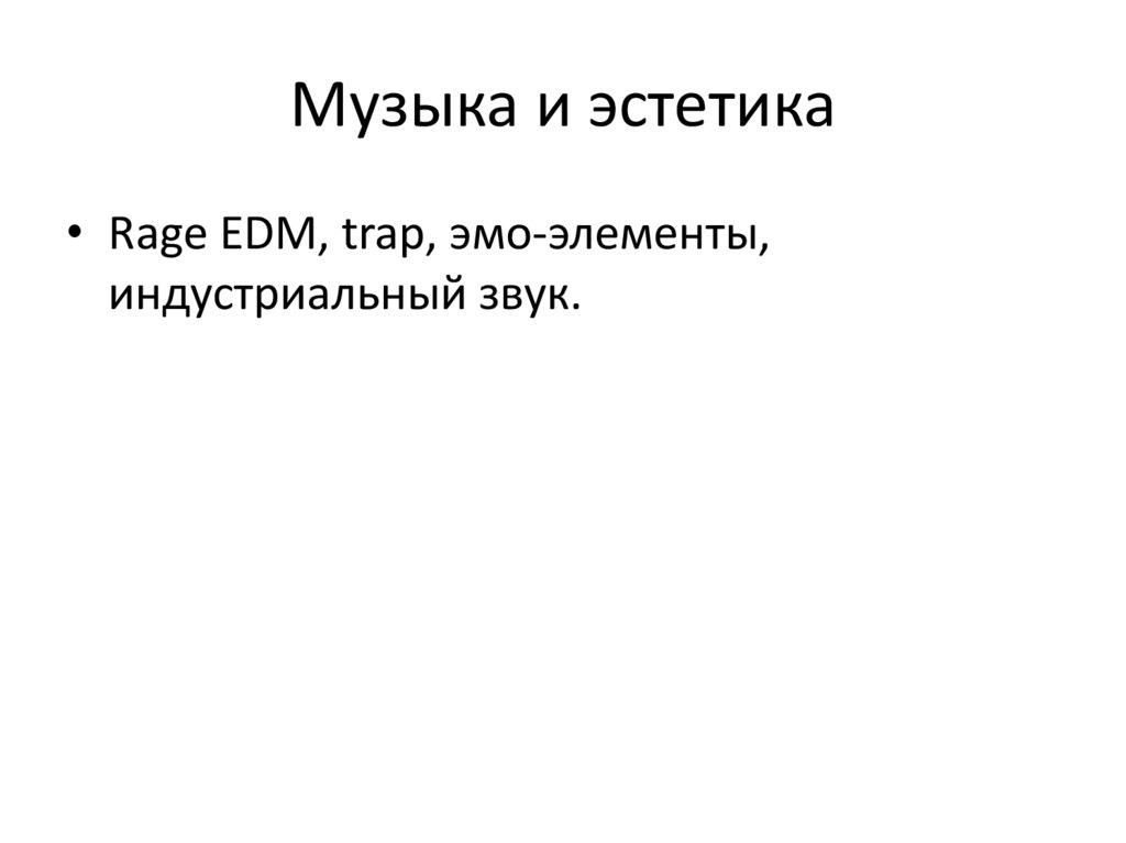 Музыка и эстетика• Rage EDM, trap, эмо-элементы,