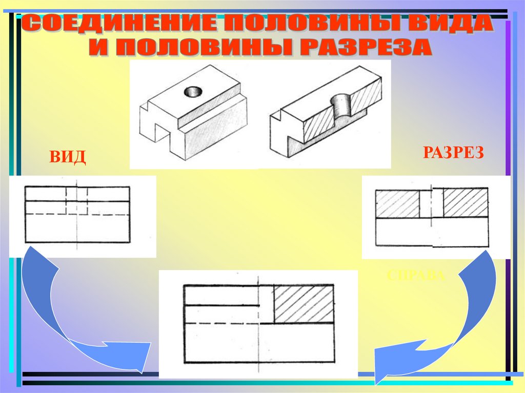 Если вид и разрез – симметричные фигуры, торазрешается соединять половину вида и половину