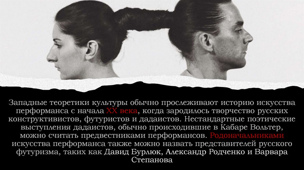 Западные теоретики культуры обычно прослеживают историю искусстваперформанса с начала XX века, когда зародилось творчество русских