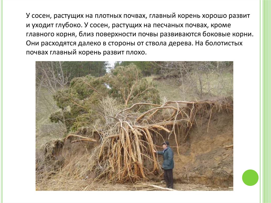 У сосен, растущих на плотных почвах, главный корень хорошо развити уходит глубоко. У сосен, растущих на песчаных почвах, кроме