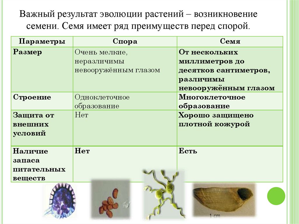 Важный результат эволюции растений – возникновениесемени. Семя имеет ряд преимуществ перед спорой.