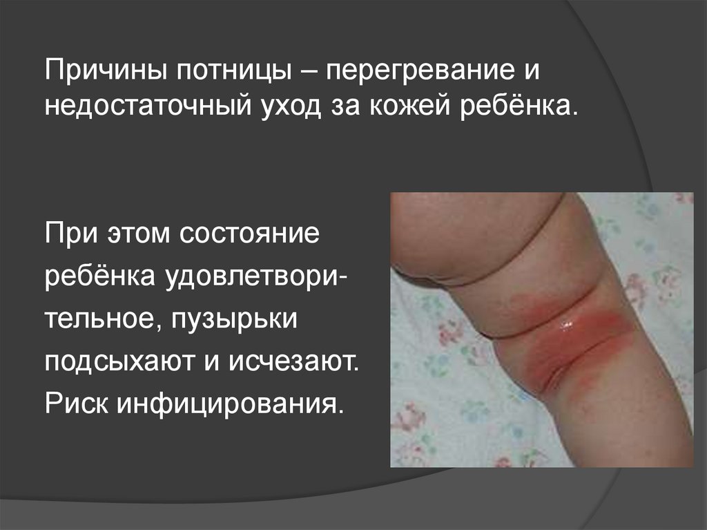 Причины потницы – перегревание инедостаточный уход за кожей ребёнка.