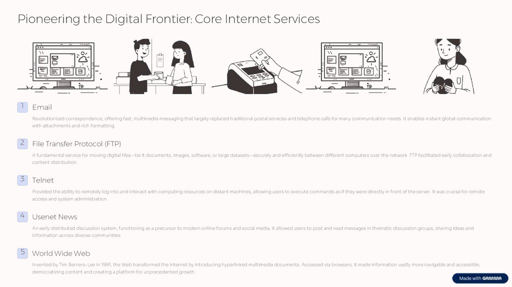 Invented by Tim Berners-Lee in 1991, the Web transformed the Internet by introducing hyperlinked multimedia documents. Accessed via browsers, it made information vastly more navigable and accessible,
