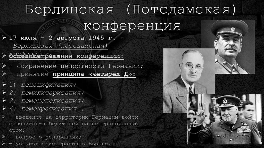 17 июля – 2 августа 1945 г. –Берлинская (Потсдамская)