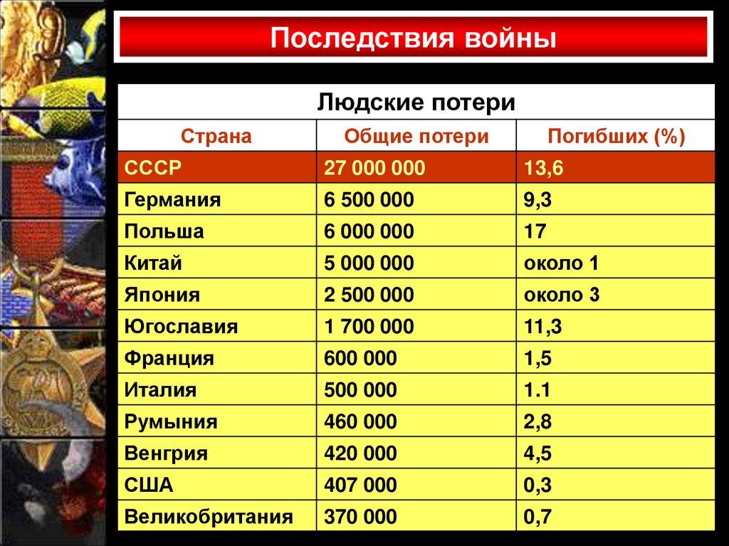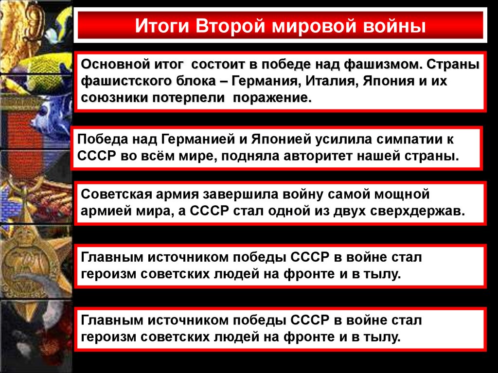 Итоги Второй мировой войныОсновной итог состоит в победе над фашизмом. Страны