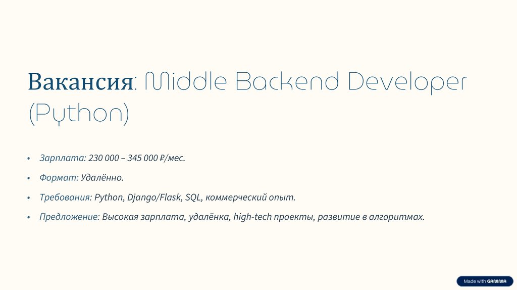 • Требования: Python, Django/Flask, SQL, коммерческий опыт.