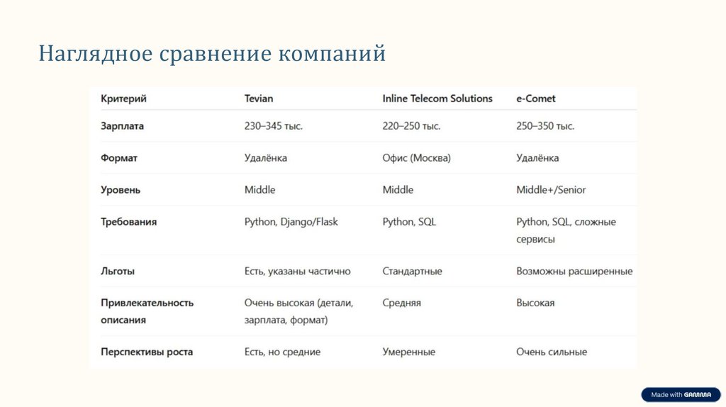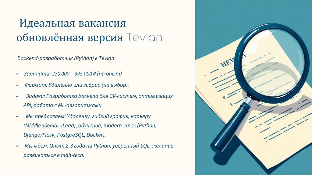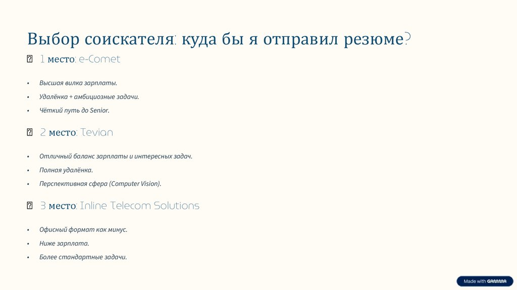 • Предложение: Высокая зарплата, удалёнка, high-tech проекты, развитие в алгоритмах.