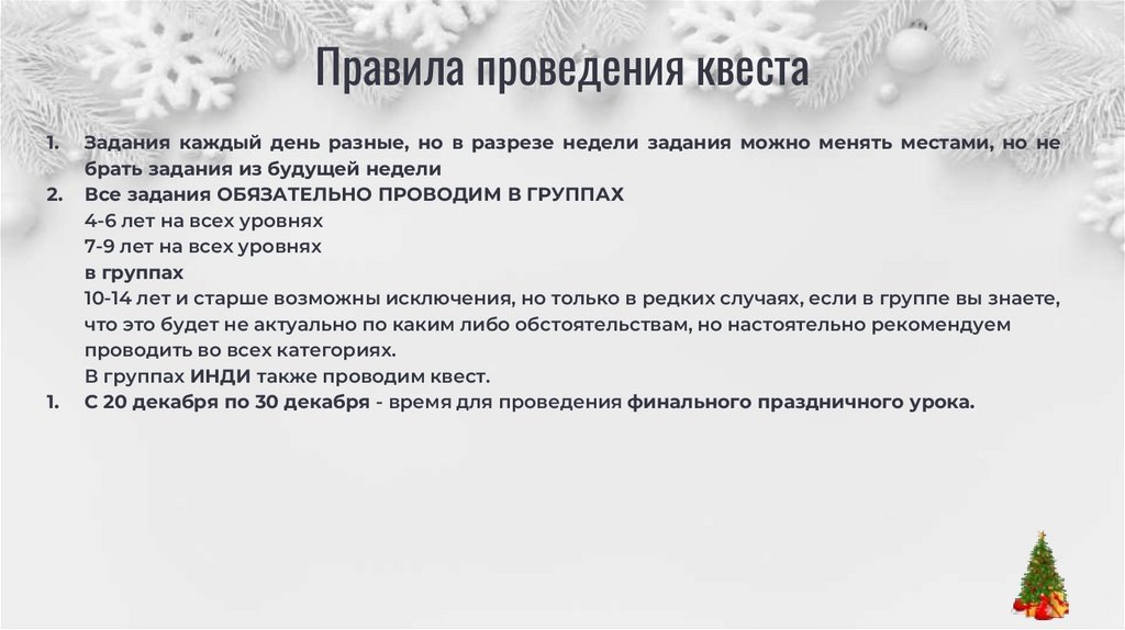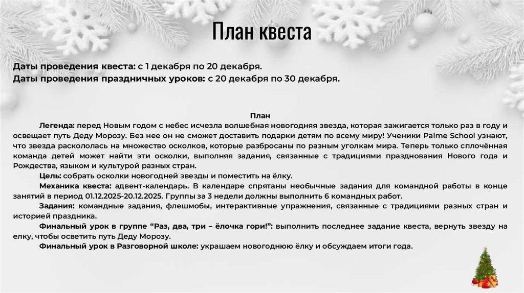 План квестаДаты проведения квеста: с 1 декабря по 20 декабря.