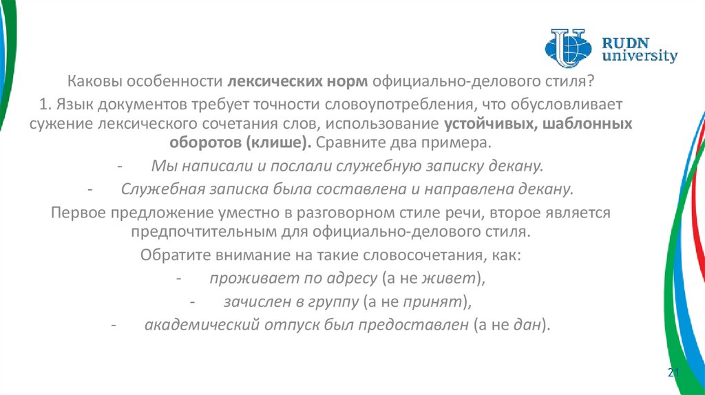 Каковы особенности лексических норм официально-делового стиля?1. Язык документов требует точности словоупотребления, что обусловливает