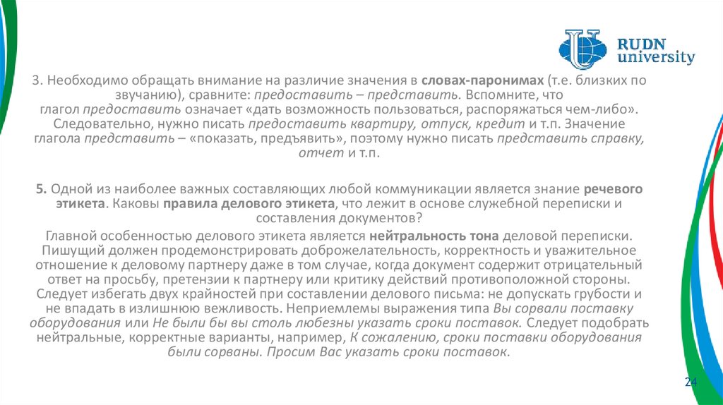 3. Необходимо обращать внимание на различие значения в словах-паронимах (т.е. близких позвучанию), сравните: предоставить – представить. Вспомните, что