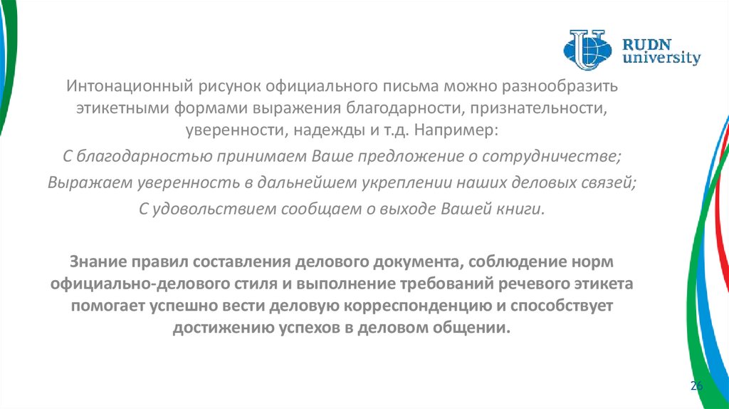 Интонационный рисунок официального письма можно разнообразитьэтикетными формами выражения благодарности, признательности,