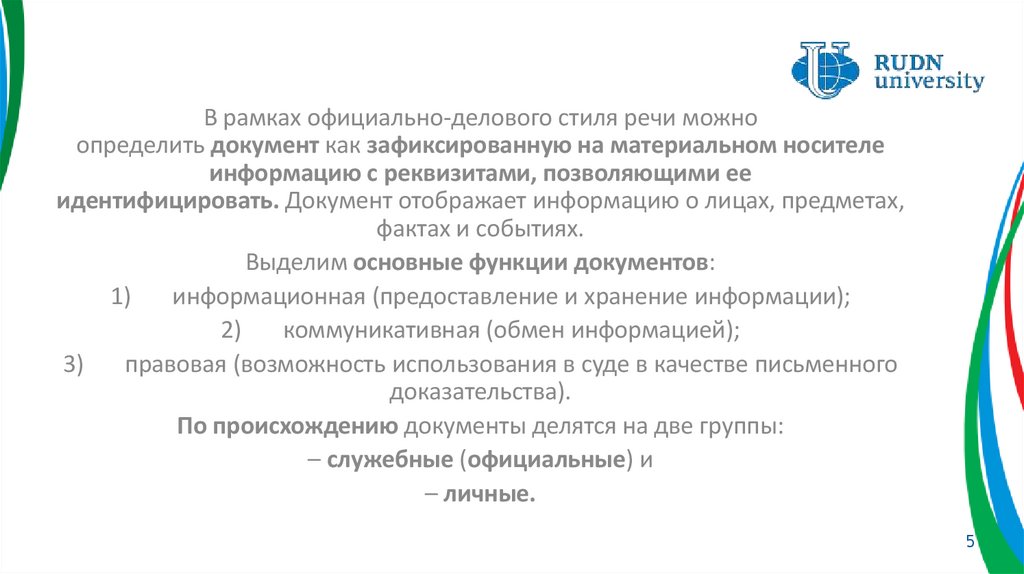 В рамках официально-делового стиля речи можноопределить документ как зафиксированную на материальном носителе