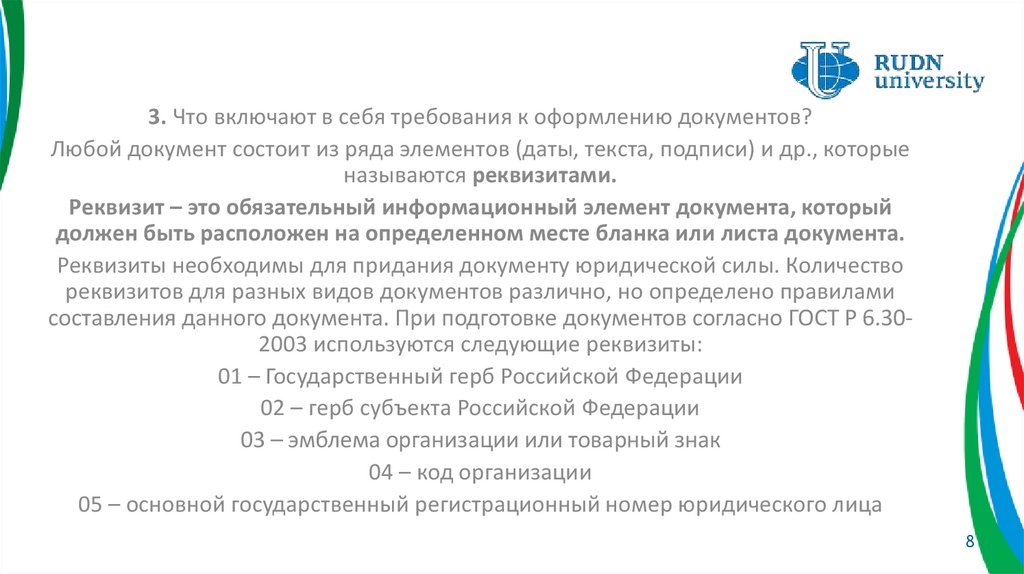 3. Что включают в себя требования к оформлению документов?Любой документ состоит из ряда элементов (даты, текста, подписи) и др., которые