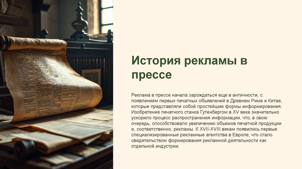 Реклама в прессе начала зарождаться еще в античности, с