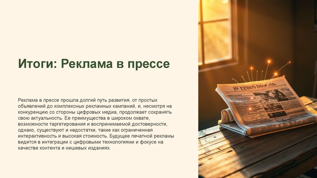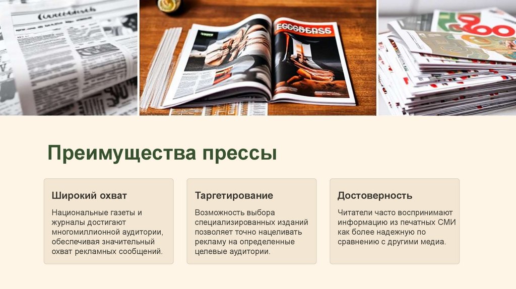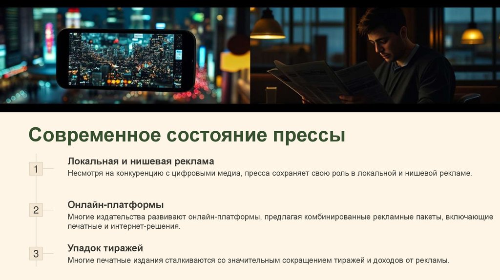 Несмотря на конкуренцию с цифровыми медиа, пресса сохраняет свою роль в локальной и нишевой рекламе.