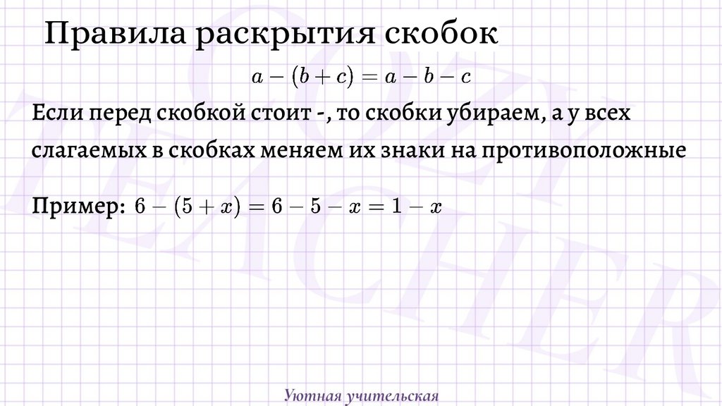 Правила раскрытия скобокЕсли перед скобкой стоит -, то скобки убираем, а у всех