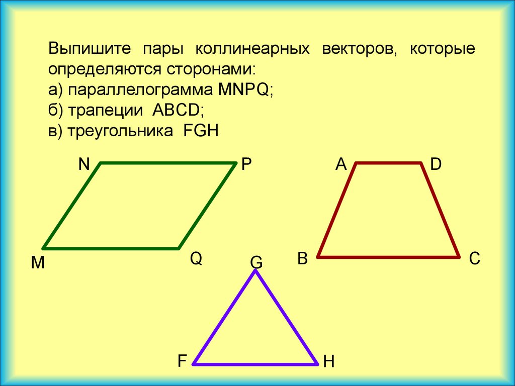 Выпишите пары коллинеарных векторов, которыеопределяются сторонами:
