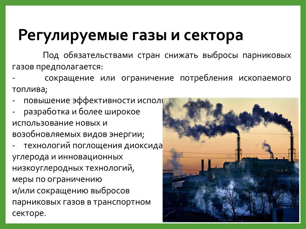 Регулируемые газы и сектораПод обязательствами стран снижать выбросы парниковых