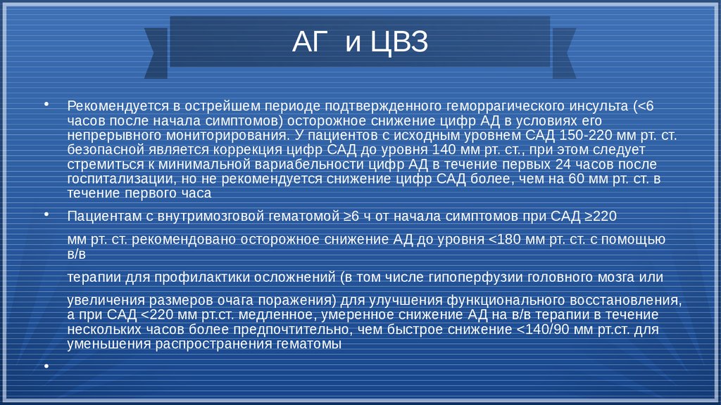 АГ и ЦВЗРекомендуется в острейшем периоде подтвержденного геморрагического инсульта (<6