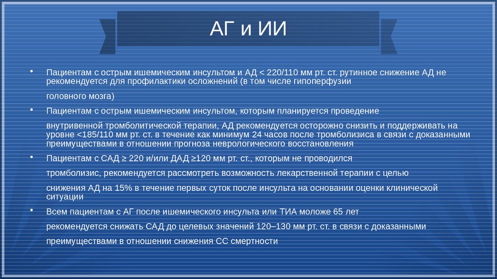 АГ и ИИПациентам c острым ишемическим инсультом и АД < 220/110 мм рт. ст. рутинное снижение АД не