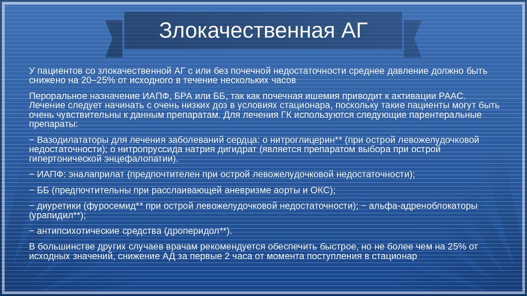 Злокачественная АГУ пациентов со злокачественной АГ с или без почечной недостаточности среднее давление должно быть