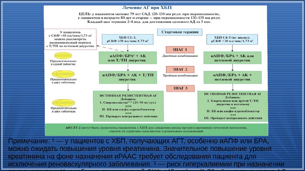 Примечание: ¹ — у пациентов с ХБП, получающих АГТ, особенно иАПФ или БРА,можно ожидать повышения уровня креатинина. Значительное повышение уровня