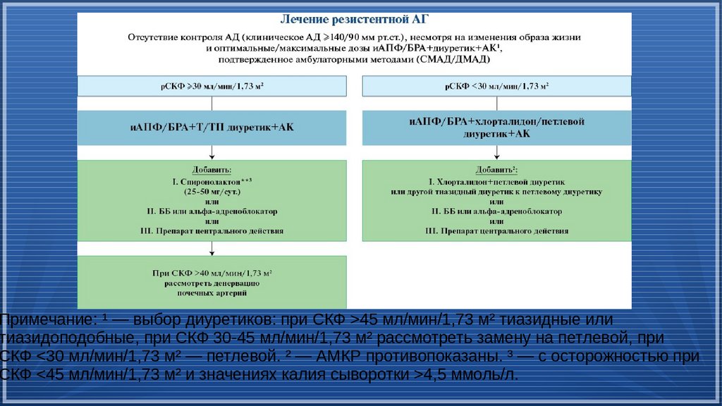 Примечание: ¹ — выбор диуретиков: при СКФ >45 мл/мин/1,73 м² тиазидные илитиазидоподобные, при СКФ 30-45 мл/мин/1,73 м² рассмотреть замену на петлевой, при