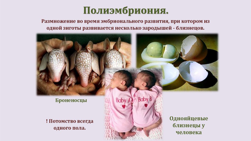 Полиэмбриония.Размножение во время эмбрионального развития, при котором из