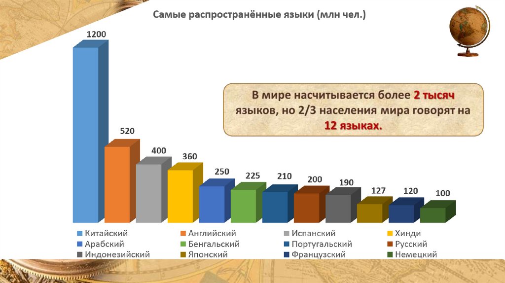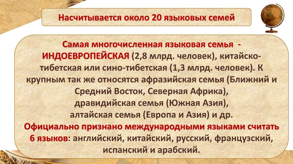 Насчитывается около 20 языковых семейСамая многочисленная языковая семья ИНДОЕВРОПЕЙСКАЯ (2,8 млрд. человек), китайскотибетская или сино-тибетская (1,3 млрд. человек). К