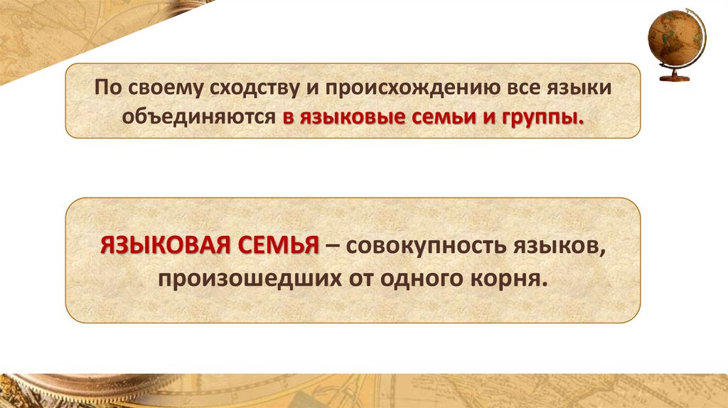 По своему сходству и происхождению все языкиобъединяются в языковые семьи и группы.