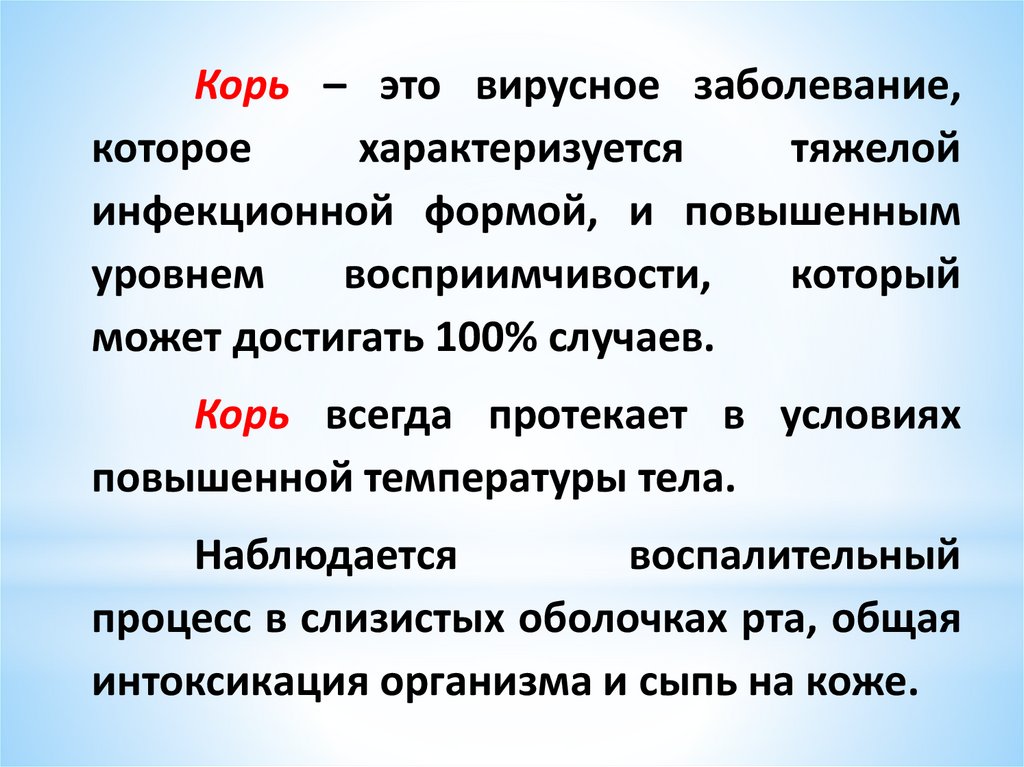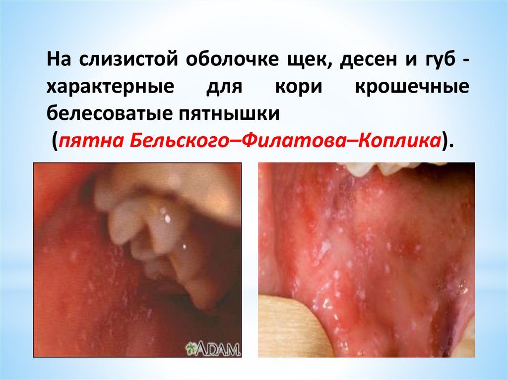 На слизистой оболочке щек, десен и губ характерные для кори крошечныебелесоватые пятнышки