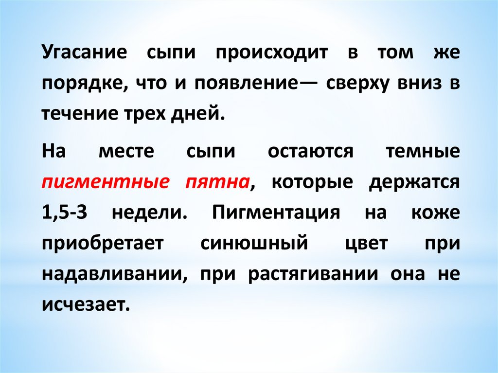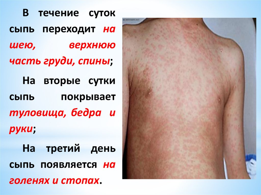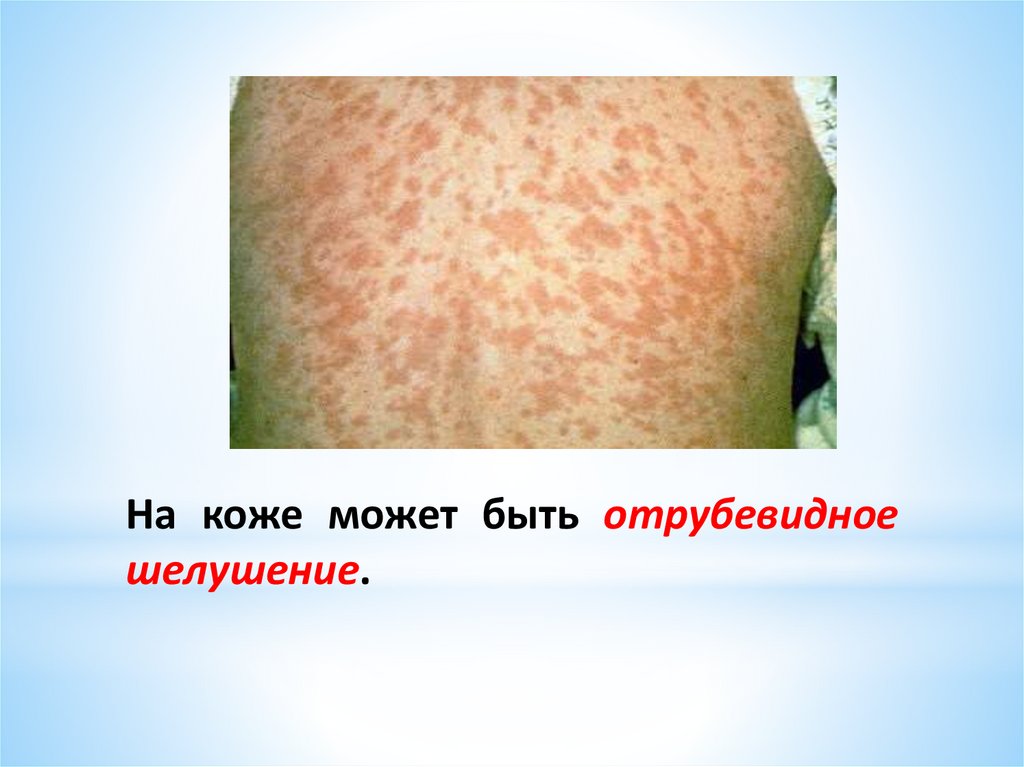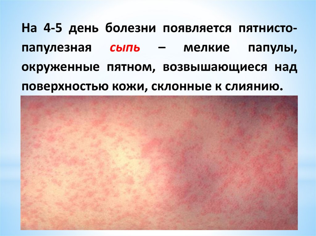 На 4-5 день болезни появляется пятнистопапулезная сыпь – мелкие папулы,окруженные пятном, возвышающиеся над