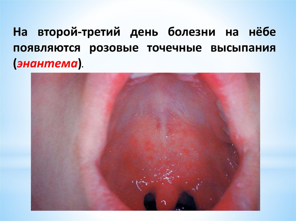 На второй-третий день болезни на нёбепоявляются розовые точечные высыпания