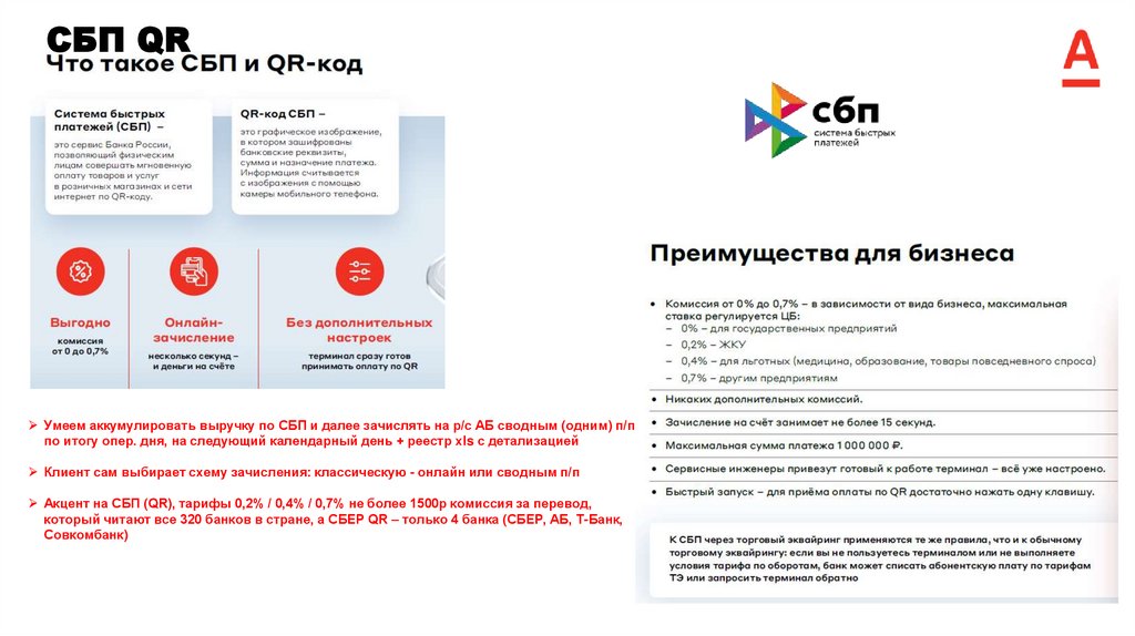 Акцент на СБП (QR), тарифы 0,2% / 0,4% / 0,7% не более 1500р комиссия за перевод,