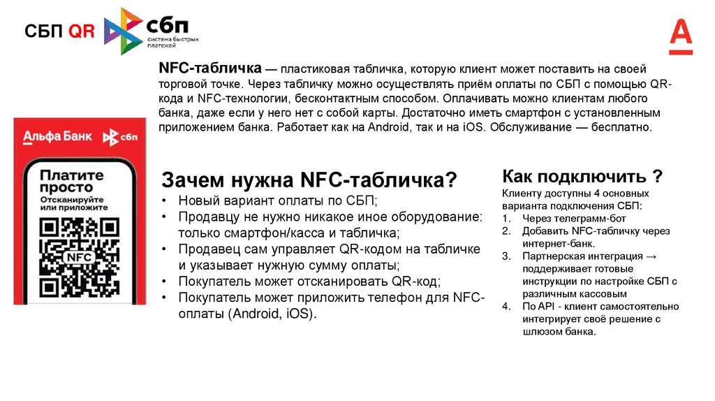 торговой точке. Через табличку можно осуществлять приём оплаты по СБП с помощью QRкода и NFC-технологии, бесконтактным способом. Оплачивать можно клиентам любого