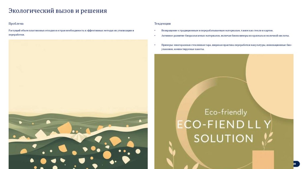 Активное развитие биоразлагаемых материалов, включая биополимеры из крахмала и молочной кислоты.