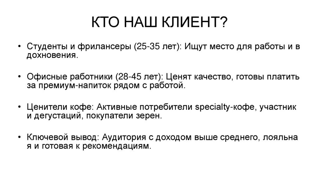 КТО НАШ КЛИЕНТ?• Студенты и фрилансеры (25-35 лет): Ищут место для работы и в